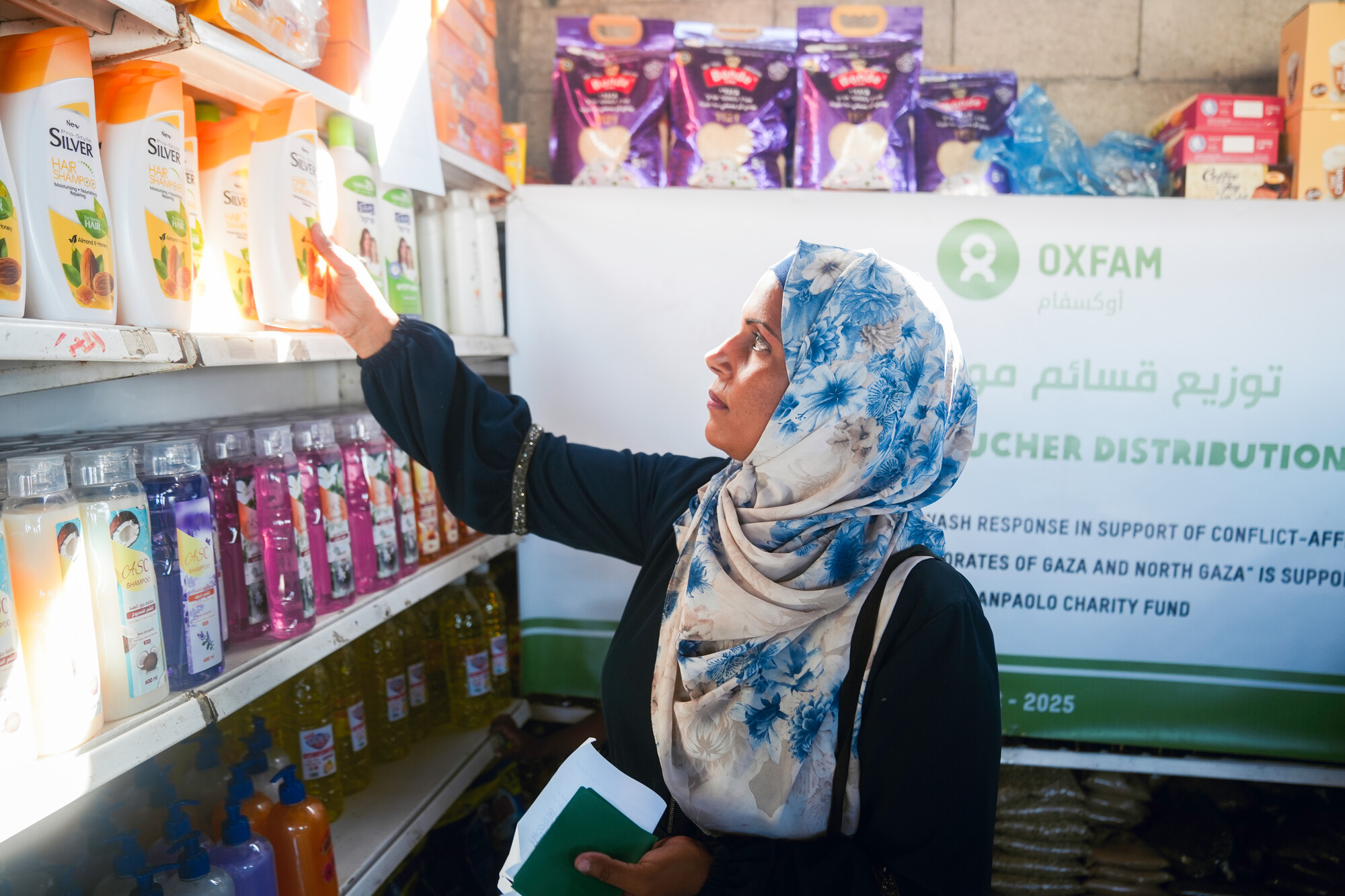 A shopper selects hygiene supplies while an Oxfam “Hygiene Voucher Distribution” banner hangs in the background at a shop. Photo: Mosab Al-Borno/ Alef Multimedia/ Oxfam